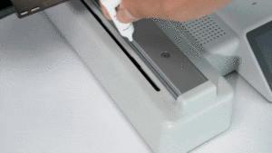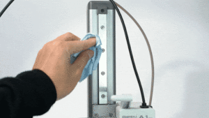 Dùng khăn giấy hoặc vải sợi nhỏ để lau sạch thanh dẫn hướng tuyến tính trục Z nhằm loại bỏ bụi bẩn, mảnh vụn hoặc bất kỳ chất bám bẩn nào, như hình minh họa.