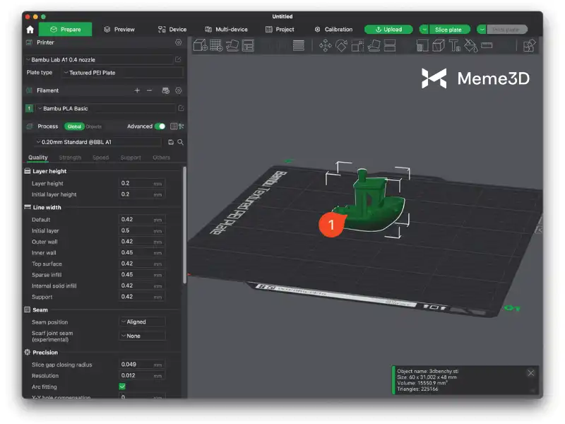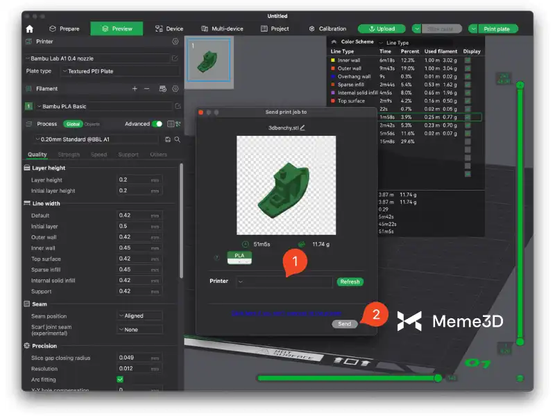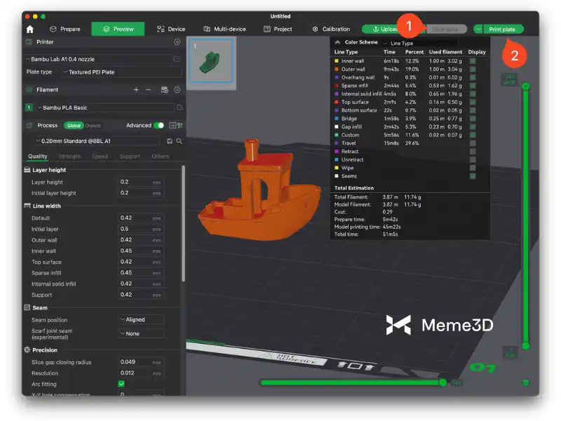 Khi bạn đã sẵn sàng, hãy nhấp vào nút Slice plate (như hình minh họa ở bước 1), thao tác này sẽ bắt đầu chuẩn bị tệp và chuyển đổi nó thành định dạng .gcode mà máy in hiểu được. Phần mềm cắt lát sẽ hiển thị danh sách thông tin liên quan đến thời gian in mô hình, lượng sợi nhựa đã sử dụng và các chi tiết nâng cao khác.