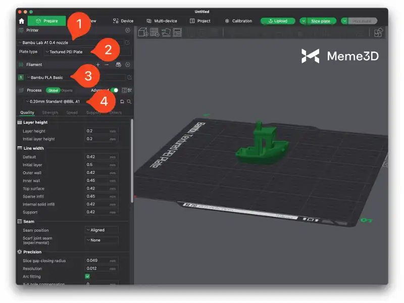 Tiếp theo, hãy đảm bảo bạn đã chọn đúng kiểu máy in, loại tấm in, loại sợi in và chiều cao lớp in. Tất cả các thiết lập này sẽ ảnh hưởng đến các thiết lập nâng cao hơn được cấu hình trong phần mềm cắt lát và có thể góp phần vào chất lượng in của mô hình hoàn thiện.