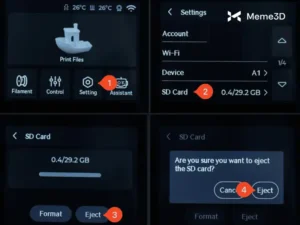 Trước tiên, hãy tháo thẻ Micro SD khỏi máy in. Nhưng trước khi làm vậy, hãy đảm bảo bạn đã đẩy thẻ ra bằng giao diện menu, vì A1 mini không hỗ trợ cắm nóng thẻ MicroSD.