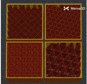 Mỗi kiểu cấu trúc đều có những đặc tính riêng biệt: ví dụ, kiểu tổ ong và kiểu xoắn ốc mang lại tỷ lệ độ bền trên trọng lượng tốt, trong khi kiểu lưới và kiểu tam giác cung cấp khả năng hỗ trợ cấu trúc đơn giản với tốc độ nhanh hơn.