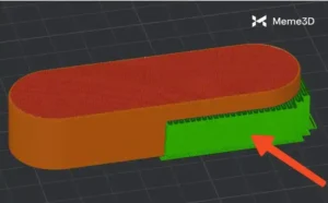 Trong hình ảnh bên dưới, mô hình được định hướng theo cách tạo ra chất lượng in không đồng nhất, với các đường lớp và yêu cầu vật liệu hỗ trợ tăng lên bên dưới mô hình. Do hướng định vị của mô hình, vật liệu hỗ trợ có thể làm hỏng mô hình và khiến việc loại bỏ trở nên khó khăn hơn.