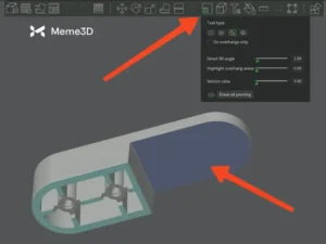 Một trong những tính năng hữu ích nhất để hỗ trợ in 3D trong Bambu Studio là Tô màu hỗ trợ (Support Painting). Với tùy chọn này, bạn có thể tô màu các phần trên mô hình nơi bạn muốn tạo ra cấu trúc hỗ trợ, trong ví dụ này, được đánh dấu bằng màu tím. Với Tô màu hỗ trợ, bạn có thể giảm thiểu lượng sợi nhựa cần dùng cho việc tạo cấu trúc hỗ trợ.