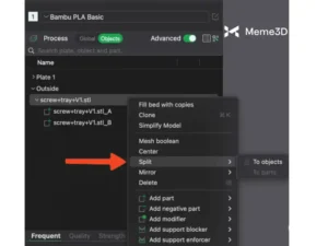 Lúc này, bạn cần nhấp chuột phải vào mô hình chính, chọn Split → To objects . Thao tác này sẽ biến mô hình đã cắt thành hai mô hình khác nhau có thể di chuyển độc lập trong Bambu Studio.
