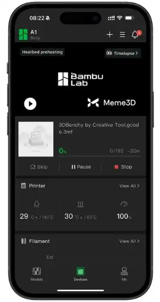 Bambu Handy là ứng dụng di động tương thích với iOS và Android, cho phép điều khiển từ xa các chức năng của máy in. Bạn có thể điều khiển từng trục của máy in, kiểm tra camera của máy in để xác nhận mọi thứ hoạt động bình thường và điều chỉnh các cài đặt cơ bản như tốc độ in hoặc nhiệt độ.
