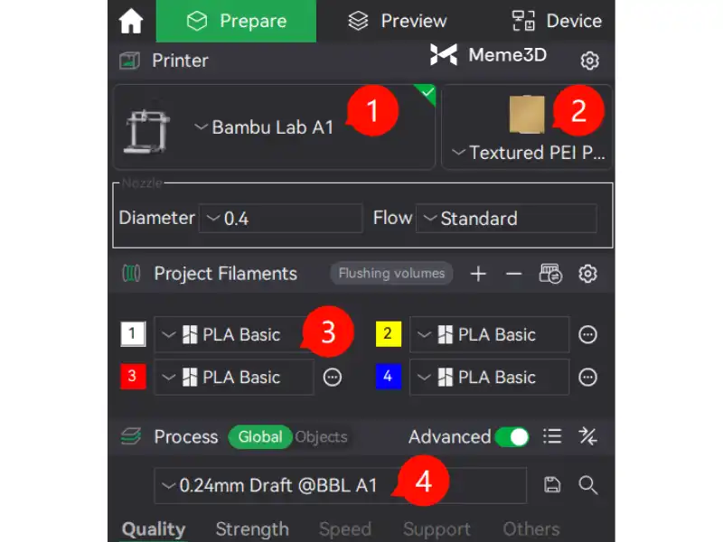 - Chọn máy in bạn muốn sử dụng để in mô hình và kích thước vòi phun phù hợp (mặc định là 0.4mm).