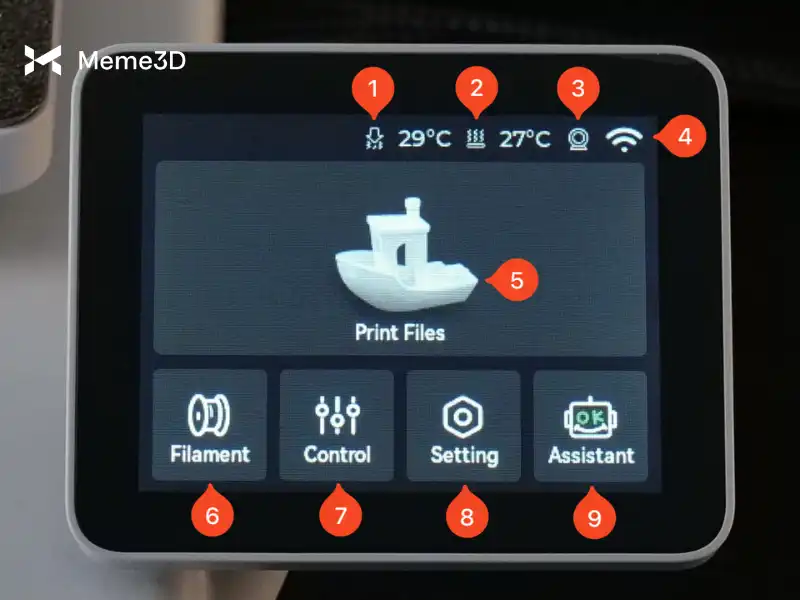 - Biểu tượng trạng thái cảm biến sợi nhựa – Cho biết trạng thái của sợi nhựa. Khi sợi nhựa được nạp đúng cách, một chấm màu xanh lá cây sẽ xuất hiện, xác nhận rằng nó đang nằm bên trong bộ đùn.