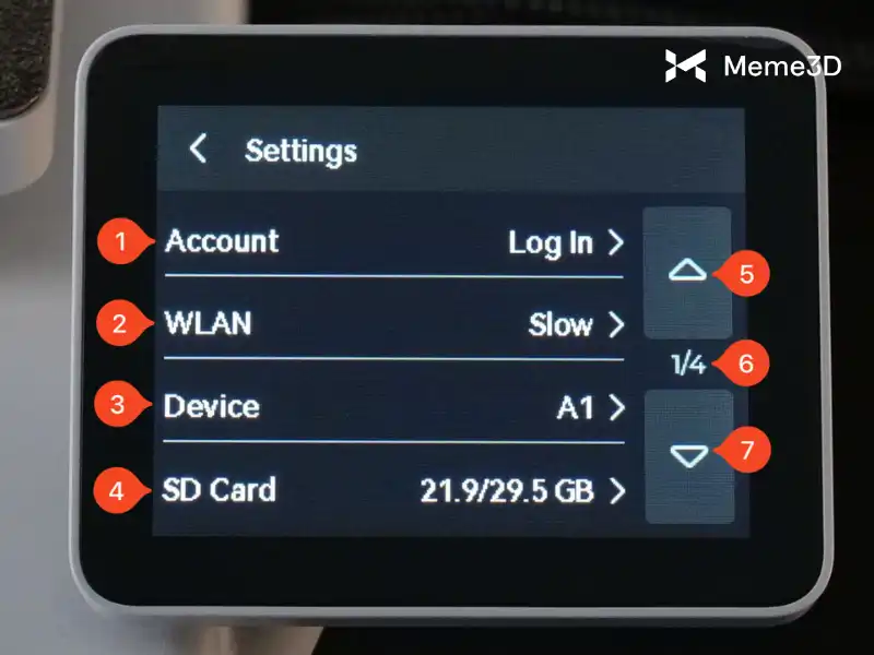- Thẻ SD – Mở một menu phụ cho phép bạn xem chi tiết thẻ Micro SD, định dạng và tháo thẻ an toàn khi máy in đang hoạt động. Luôn sử dụng nút Tháo thẻ trước khi lấy thẻ ra để tránh làm hỏng dữ liệu.