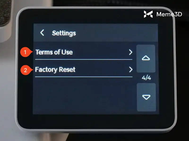 - Nút mũi tên xuống – Di chuyển đầu đùn về phía trước, đùn sợi nhựa. Hữu ích cho việc nạp sợi nhựa thủ công hoặc làm sạch vật liệu.