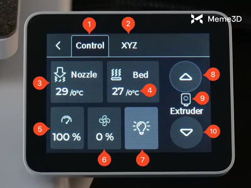 - Điều khiển – Truy cập vào tab Điều khiển, cho phép bạn điều chỉnh nhiệt độ, tốc độ in và di chuyển trục máy in thủ công.