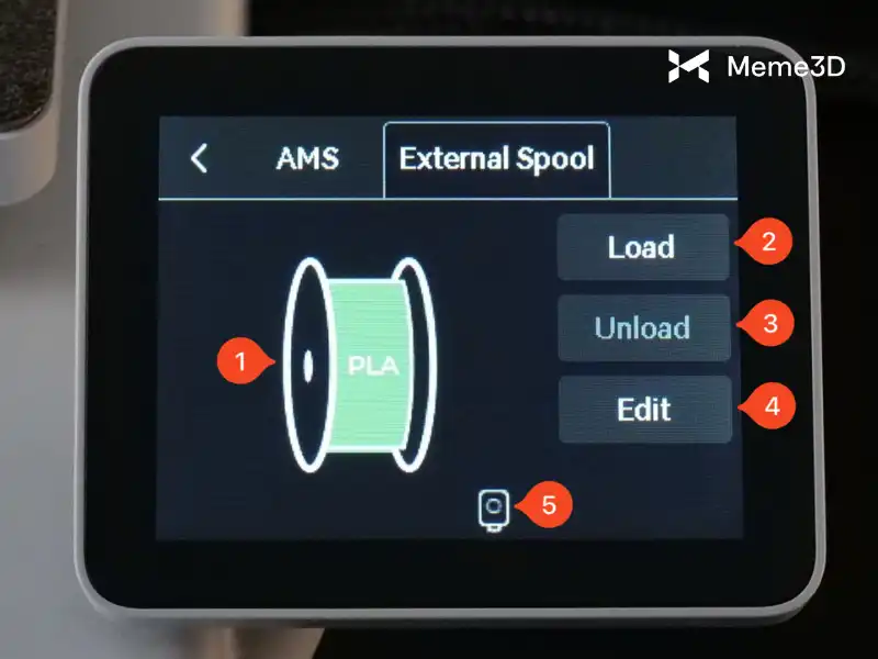 - Biểu tượng cuộn dây filament – Hiển thị loại và màu filament hiện đang được nạp hoặc thiết lập trên máy in. Khi được kết nối AMS lite, loại và màu filament sẽ được tự động phát hiện và cấu hình trên máy in.
