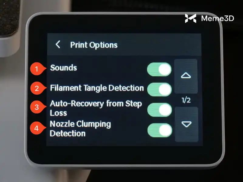 - Tự động phục hồi khi mất bước – Giám sát chuyển động của động cơ trong quá trình in và cố gắng phục hồi nếu đầu in hoặc bàn nhiệt bị va chạm, ngăn ngừa hiện tượng lệch lớp.