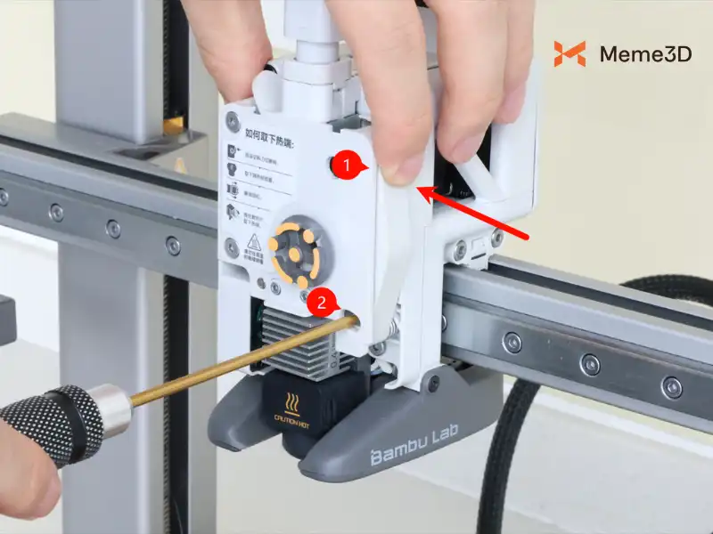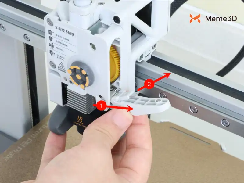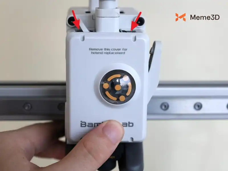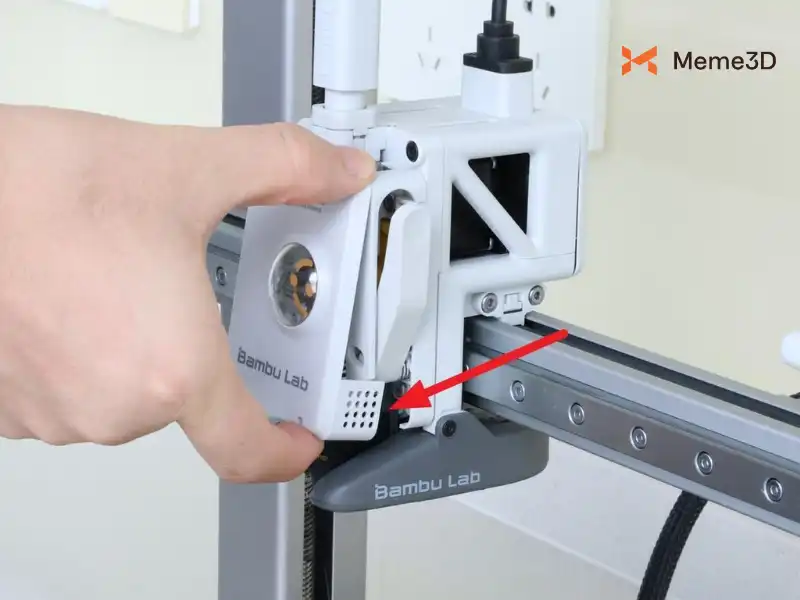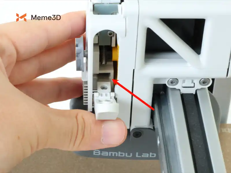 Bước đầu tiên để thay thế lưỡi cắt sợi nhựa trên máy in A1 là tháo nắp trước của đầu in. Nắm lấy phần đế của nắp trước và nhẹ nhàng kéo về phía bạn.