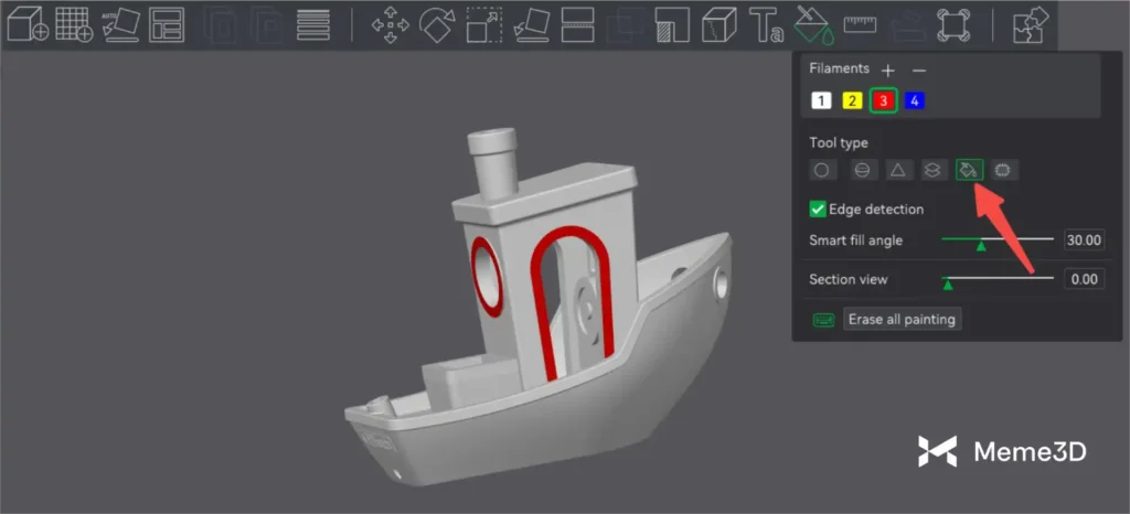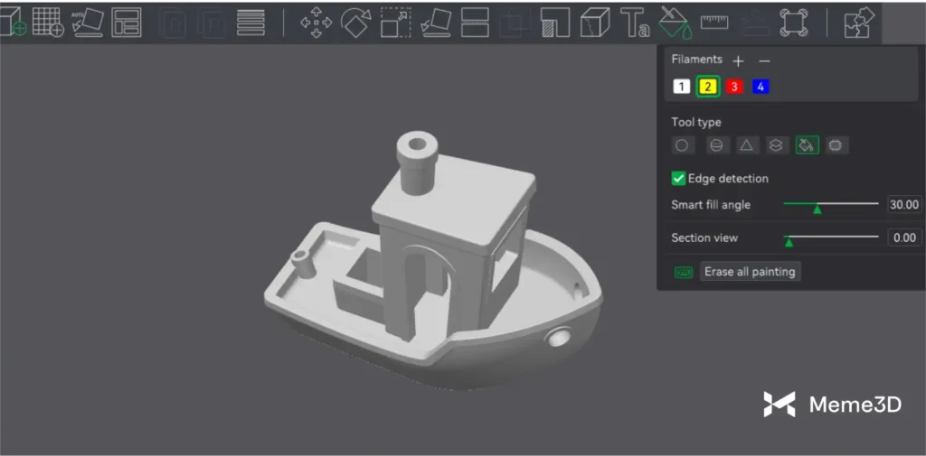 Sau khi nhập mô hình 3D vào Bambu Studio , bạn có thể bắt đầu chuẩn bị cho việc in nhiều màu bằng công cụ Tô màu . Công cụ này cho phép bạn dễ dàng gán các màu khác nhau cho các phần cụ thể của mô hình.