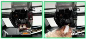 Ngoài ra, hãy làm sạch các vạch đánh dấu trên đầu phun bên trái để đảm bảo chúng hiển thị rõ ràng. Lau sạch các lớp silicon của đầu phun. Tiếp theo, lau sạch nắp trước của bộ đùn, bộ dẫn sợi của bộ đùn và phần trên của bộ đùn để loại bỏ bụi bẩn.