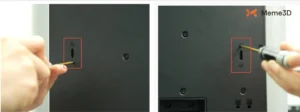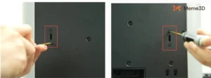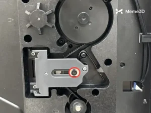 Bước tiếp theo là đảm bảo dây đai trục Z được siết chặt đúng cách. Để làm điều này, hãy bắt đầu bằng cách tháo nắp kính phía trên, nghiêng máy in và sử dụng tua vít H2.0 để nới lỏng vít điều chỉnh độ căng. Nhưng đừng tháo vít được đánh dấu bên dưới.