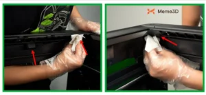 Lau sạch thanh dẫn hướng tuyến tính trục Y bằng vải không xơ đã được xịt cồn, sau đó di chuyển khung máy sang phía đối diện bằng tay và lau lại để đảm bảo toàn bộ trục được làm sạch kỹ lưỡng.