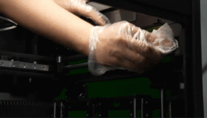 Hạ bàn nhiệt xuống bằng màn hình điều khiển, sau đó dùng khăn không xơ thấm cồn để lau sạch camera đầu phun và camera vòi phun.