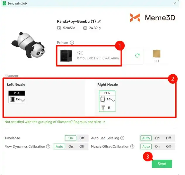 Kết nối các sợi nhựa với vòi phun thích hợp như hình minh họa (thông qua cuộn dây bên ngoài hoặc bên trong AMS được kết nối với vòi phun thích hợp). Sau khi hoàn tất, nhấn Print Plate. Trong cửa sổ Send print job, xác nhận đã chọn đúng máy in (1), xác nhận (hoặc sửa đổi) các lựa chọn sợi nhựa đã kết nối (2), sau đó nhấn Send Print (3).