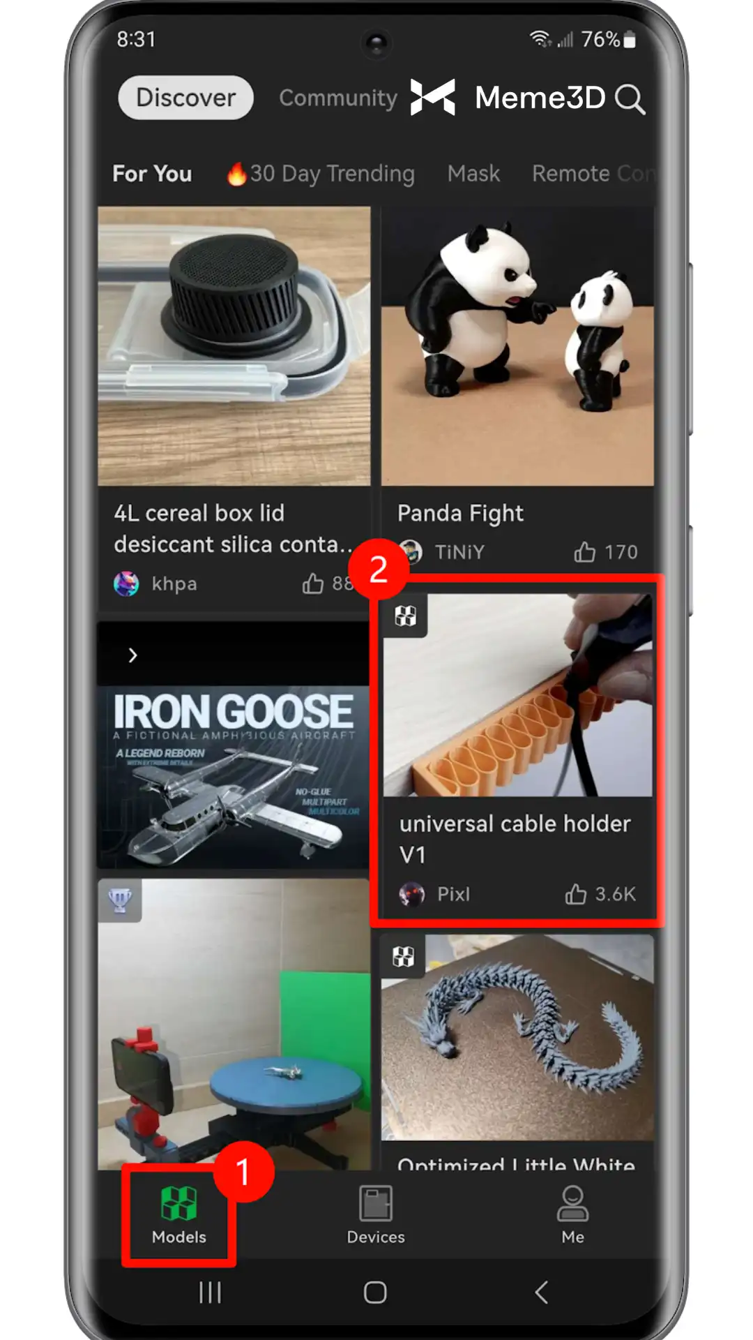 Bắt đầu thật dễ dàng! Chỉ cần mở ứng dụng Bambu Handy và điều hướng đến tab Mô hình để khám phá và in một cách dễ dàng. Khi bạn tìm thấy một mô hình mình thích, chỉ cần chạm vào nó.