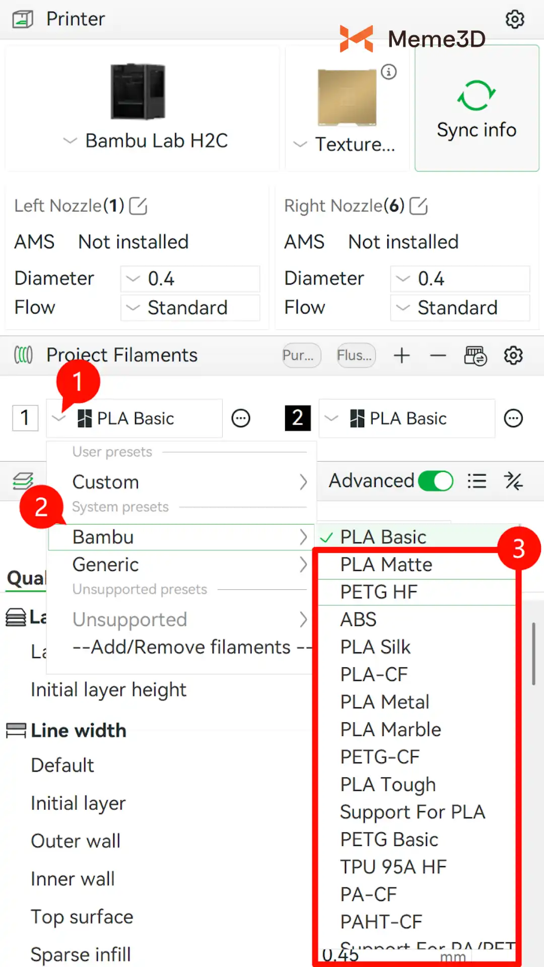 Nếu bạn không có PLA cơ bản nhưng lại có hai màu của một loại sợi khác, bạn phải thay đổi loại sợi cho phù hợp với loại bạn sẽ sử dụng trong menu thả xuống cho mỗi loại sợi.