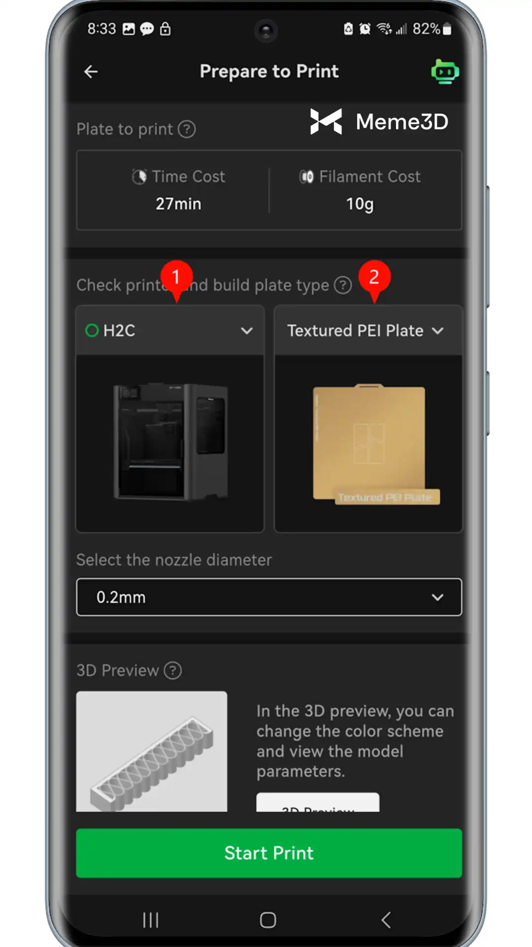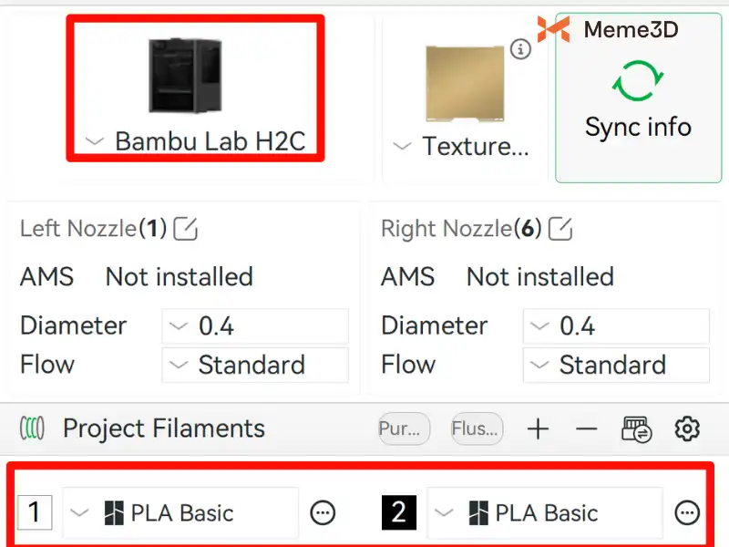 Tiếp theo, bạn cần chọn kiểu máy in và loại bàn in được lắp đặt trên máy in của mình. Trong ví dụ này, hãy chọn H2C và bàn in PEI có bề mặt nhám . Trước khi in, hãy đảm bảo bàn in sạch sẽ nếu cần, và luôn sử dụng bàn in tương thích với loại sợi in bạn đã chọn để có kết quả tốt nhất.