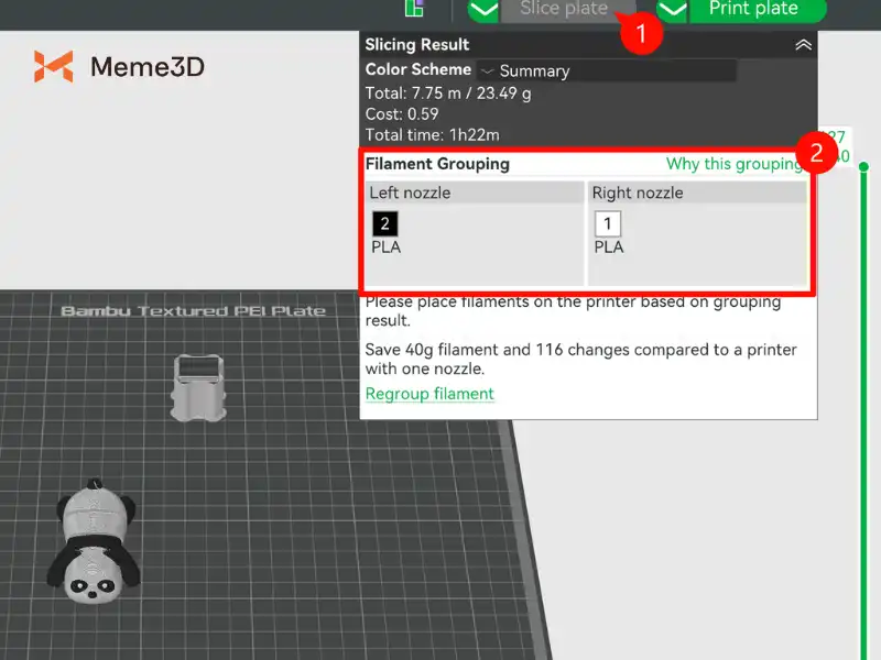 Chọn Slice Plate, sau đó quan sát Filament Grouping trong cửa sổ Slicing Result.