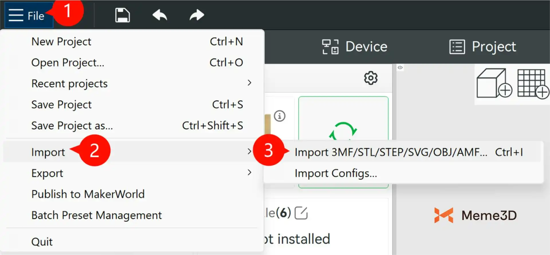 Bạn cũng có thể nhập các mô hình ngoại tuyến vào Bambu Studio để cắt lát bằng cách nhấp vào Tệp > Nhập > Nhập 3Mf… và sau đó tìm tệp STL hoặc loại tệp phù hợp khác trên máy tính của mình.