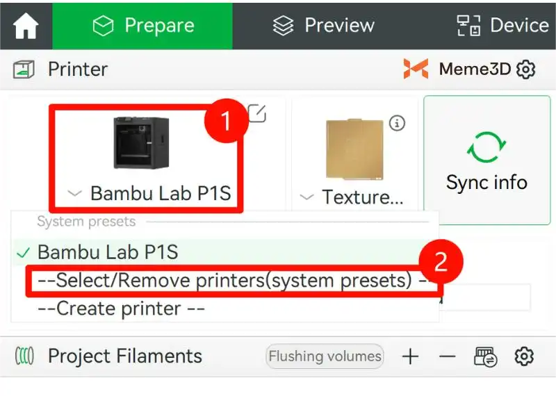Sau khi vào tab Chuẩn bị dự án, chúng ta cần đảm bảo máy in (H2C) có sẵn trong danh sách tùy chọn. Nếu H2C chưa có sẵn, hãy chọn biểu tượng máy in rồi chọn Chọn/Xóa máy in (cài đặt sẵn của hệ thống).