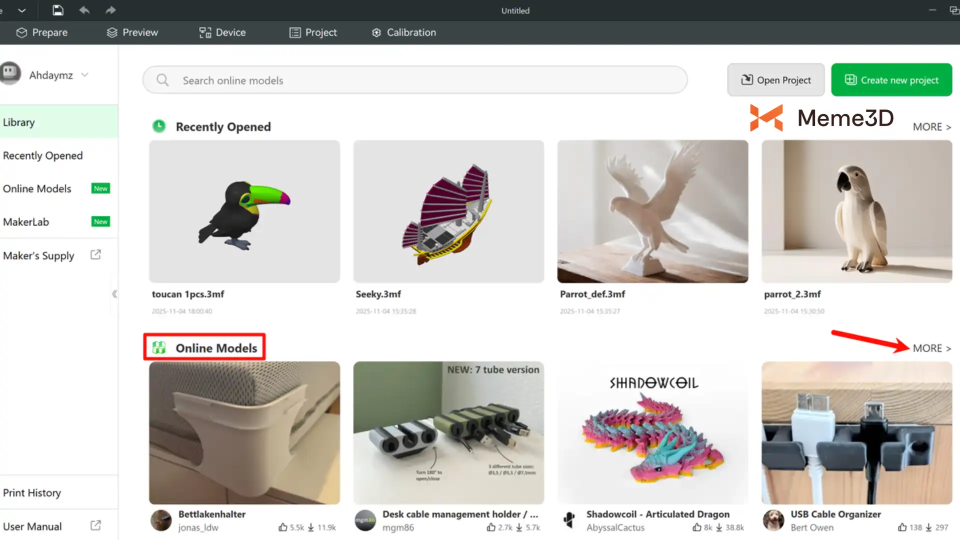 Hãy bắt đầu bằng cách mở Bambu Studio trên máy tính của bạn. Bạn có thể tải Bambu Studio về máy tính của mình tại đây . Từ trang chủ, chọn tùy chọn Thêm bên cạnh Mô hình trực tuyến.