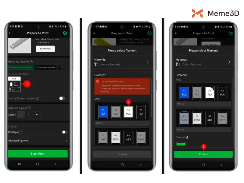 Trong ví dụ này, chúng ta sẽ sử dụng sợi nhựa PLA của Bambu Lab từ AMS. Chọn Sợi nhựa không khớp , sau đó chạm vào sợi nhựa bạn muốn sử dụng từ AMS, rồi chạm vào Xác nhận . Hãy đảm bảo sợi nhựa đã chọn tương thích với bàn in và cài đặt in của bạn để có kết quả tốt nhất.