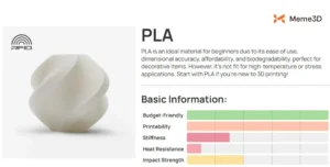 PLA (axit polylactic) là một loại sợi in 3D có nguồn gốc thực vật, có khả năng phân hủy sinh học, được ưa chuộng nhờ tính thân thiện với người dùng và mùi rất nhẹ. Nó hoàn hảo cho người mới bắt đầu, in ở nhiệt độ thấp hơn (210-220°C) với độ bám dính bề mặt tuyệt vời, thích hợp cho việc tạo mẫu thử, các sản phẩm trang trí và mô hình giáo dục. Tuy nhiên, PLA nhạy cảm với nhiệt và có thể bị biến dạng ở nhiệt độ môi trường cao, chẳng hạn như vào một ngày hè nóng bức. Mặc dù ít bị hút ẩm hơn các loại sợi khác, nhưng nó vẫn có thể bị ảnh hưởng trong điều kiện ẩm ướt, dẫn đến giảm chất lượng in, vì vậy việc bảo quản khô ráo là rất quan trọng.