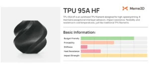 TPU (Polyurethane nhiệt dẻo) là một loại sợi in 3D dẻo, bền, lý tưởng cho các sản phẩm như ốp điện thoại, gioăng, vòng đệm và các thiết bị đeo được nhờ độ đàn hồi và độ bền cao. Mặc dù tương đối dễ in, TPU có thể cần điều chỉnh cài đặt, chẳng hạn như tốc độ in chậm hơn và tối ưu hóa độ rút sợi, để tránh tắc nghẽn và đảm bảo quá trình đùn diễn ra trơn tru. Nó rất dễ hấp thụ độ ẩm, có thể gây ra chất lượng in kém và giòn, vì vậy việc bảo quản nó trong môi trường khô ráo và làm khô trước khi in là rất cần thiết để đạt được kết quả tối ưu.