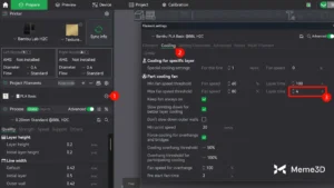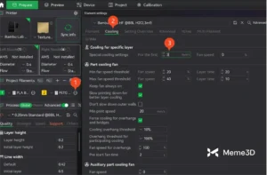Bạn có thể tìm thấy thời gian in tối thiểu trong phần cài đặt nhựa (1) ở thẻ “Cooling” (2), sau đó điều chỉnh cho phù hợp (3).