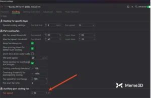 Nếu đã chọn đúng loại bàn in nhưng vật thể vẫn bị tróc, vấn đề có thể liên quan đến hệ thống làm mát. Cấu hình in PLA mặc định được thiết lập để bật Quạt Làm Mát Vật Thể (Part Cooling Fan) và Quạt Phụ Trợ ngay sau khi in xong lớp đầu tiên, nhưng với một số mô hình, điều này có thể gây ra lỗi.