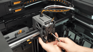 Trong một số trường hợp, bộ đùn có thể bị kẹt do một đoạn nhựa bị gãy hoặc có các mảnh vụn bên trong. Ở máy H2C, điều này có thể làm ảnh hưởng đến một hoặc cả hai đường dẫn nhựa chạy qua bộ đùn xuống các đầu gia nhiệt. Đây là sự cố rất phổ biến, đặc biệt là khi in nhựa dẻo TPU hoặc các loại nhựa giòn, nếu người dùng tự ý thay đổi tốc độ đùn hoặc tốc độ rút nhựa (retraction speeds) trong phần mềm cắt lớp, làm tăng nguy cơ đứt gãy sợi nhựa. Khi xảy ra tắc nghẽn, bạn bắt buộc phải tháo rời bộ đùn để tiếp cận các cần gạt (idler arms) và bánh răng (gears) nhằm lấy đoạn nhựa đang làm kẹt đường dẫn ra ngoài.