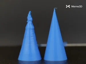 Trong ví dụ bên dưới, hình nón bên trái được in với tốc độ cao khi quạt làm mát bị tắt, trong khi hình nón bên phải được in với thông số mặc định và quạt làm mát được bật.