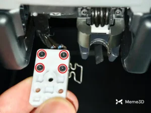 Nới lỏng bốn ốc vít (được khoanh tròn) cố định đế sứ ở bên trái. Nếu cần tháo bộ phận gia nhiệt (heating element) bên trái, bạn cũng phải tháo hai ốc vít (hình vuông) giữ tấm nẹp quản lý cáp ở bên trái, như thể hiện trong hình bên dưới.