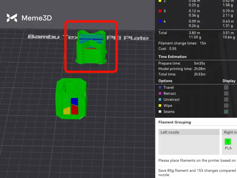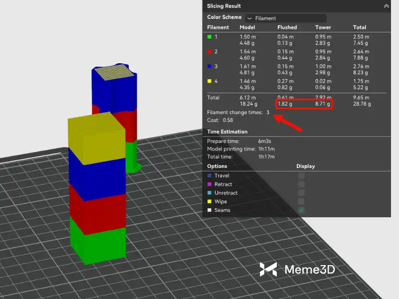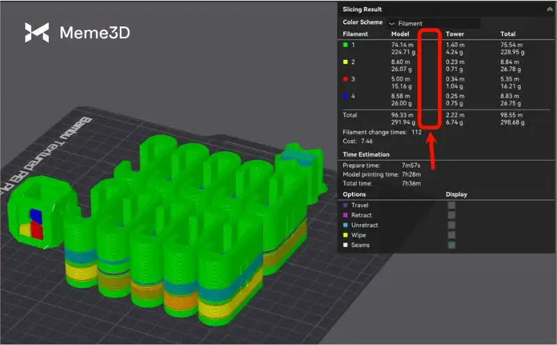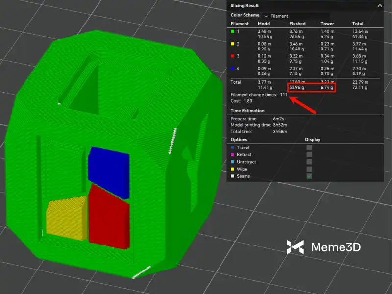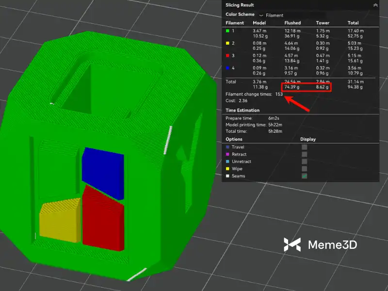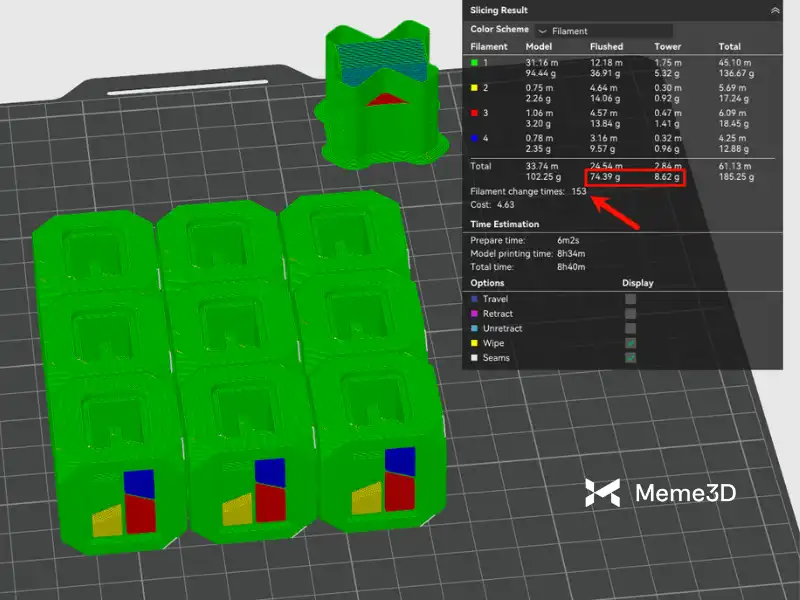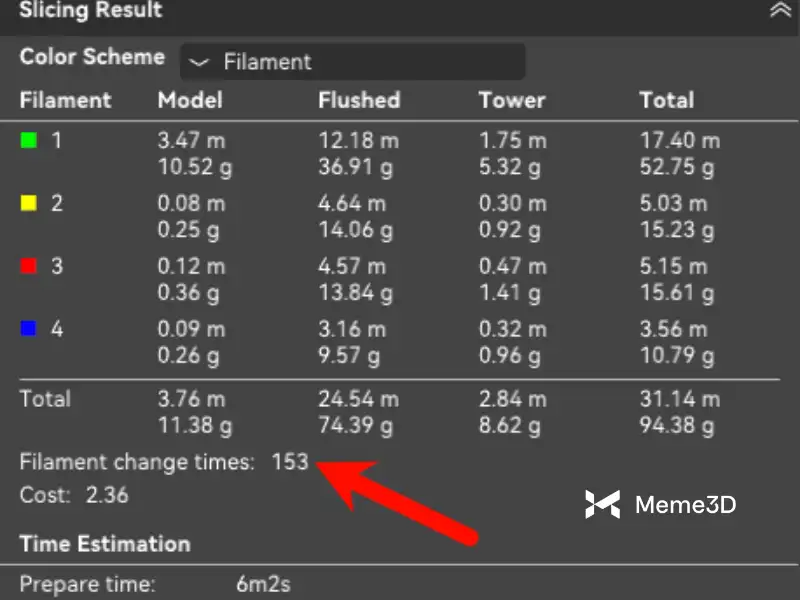 Chúng ta sẽ lấy ví dụ trước đó về một khối lập phương Bambu nhiều màu với tổng cộng 4 màu. Ở độ cao lớp 0,2mm, ta có thể thấy rằng Thời gian thay đổi sợi in hiển thị tổng cộng 153 lần thay đổi, tương ứng với 104 gram sợi in bị lãng phí.