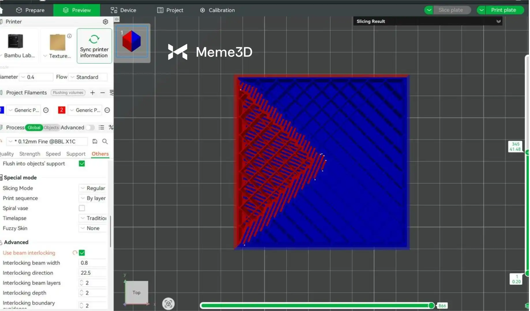 Beam Interlocking là một tính năng bổ sung các lớp liên kết giữa hai hoặc nhiều vật liệu trong quá trình in 3D đa vật liệu. Khi bạn bật tính năng này, nó sẽ liên kết các vật liệu lại với nhau bằng cách chèn các cầu nối hoặc dầm nhỏ của vật liệu này vào vật liệu kia, tạo ra một mối nối liên kết cơ học.