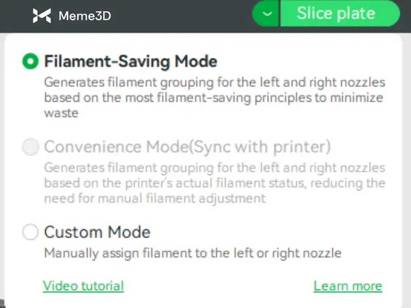 Thuật toán mặc định của máy hoạt động theo các nguyên tắc nêu trên, tương ứng với tùy chọn “Chế độ tiết kiệm nhựa” (Filament-Saving Mode) trong phần phân nhóm nhựa in (filament grouping). Đúng như tên gọi, đây là tùy chọn được khuyến nghị để giảm thiểu tối đa lượng nhựa thải ra.