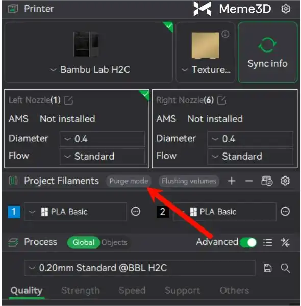 Với riêng H2C, Prime Tower thường là nguồn gây lãng phí filament chính. Tuy nhiên, lượng xả nhựa (flush/purge) này được giảm đáng kể nhờ hệ thống Vortek Hotend Change System. Do đó, khi chọn H2C, sẽ xuất hiện thêm một nút mới gọi là Purge Mode.
