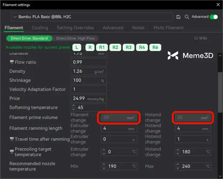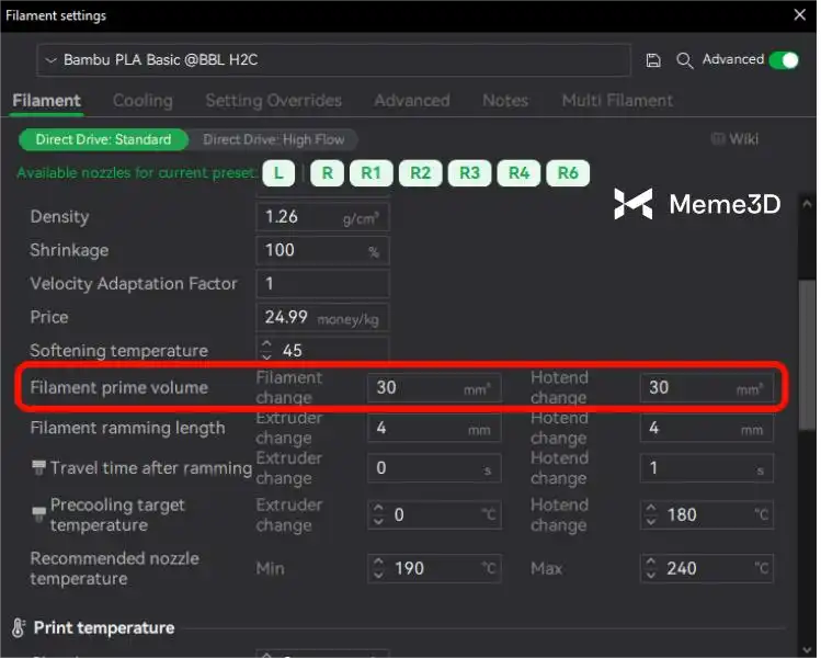 Ở chế độ Standard (mặc định), Prime Volume – lượng nhựa được đùn vào Prime Tower sau khi H2C chuyển lại sang hotend cảm ứng (induction hotend) có chứa filament đã nguội bên trong – sẽ được điều khiển bởi thiết lập Filament Prime Volume của từng loại filament.