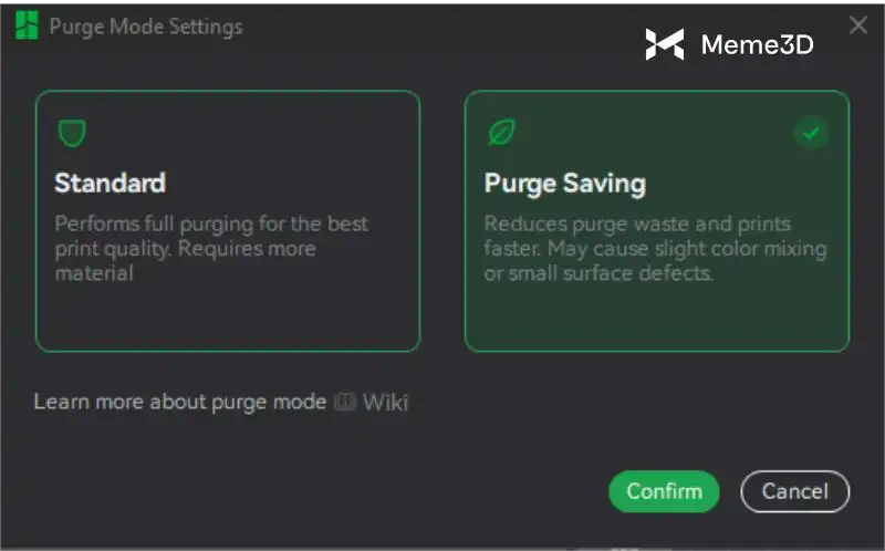Khi bật chế độ Purge Saving, các thiết lập Filament Prime Volume sẽ không còn khả dụng, vì lượng nhựa được cố định ở mức thấp hơn nhiều nhằm tiết kiệm vật liệu purge, đổi lại là chất lượng đùn nhựa sẽ giảm.
