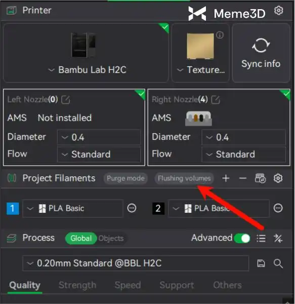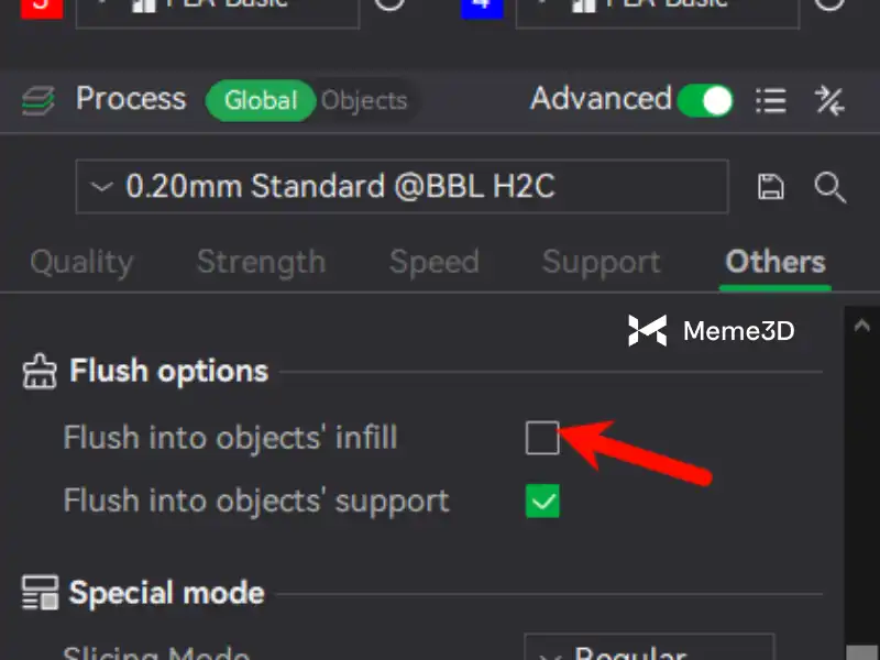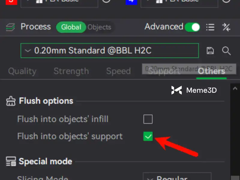 Để biết thêm chi tiết về tính năng này, vui lòng truy cập trang Wiki H2C Prime Tower Purge Mode.