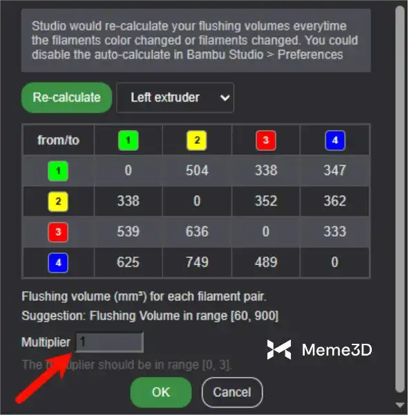 Thể tích lượng nhựa xả cho một dự án có thể được điều chỉnh toàn cục bằng trường Hệ số nhân. Như tên gọi cho thấy, hệ số nhân 1.00 là giá trị mặc định, còn 0.90 tương ứng với thể tích dung dịch xả giảm 10% cho mỗi cặp nhựa in thay thế.