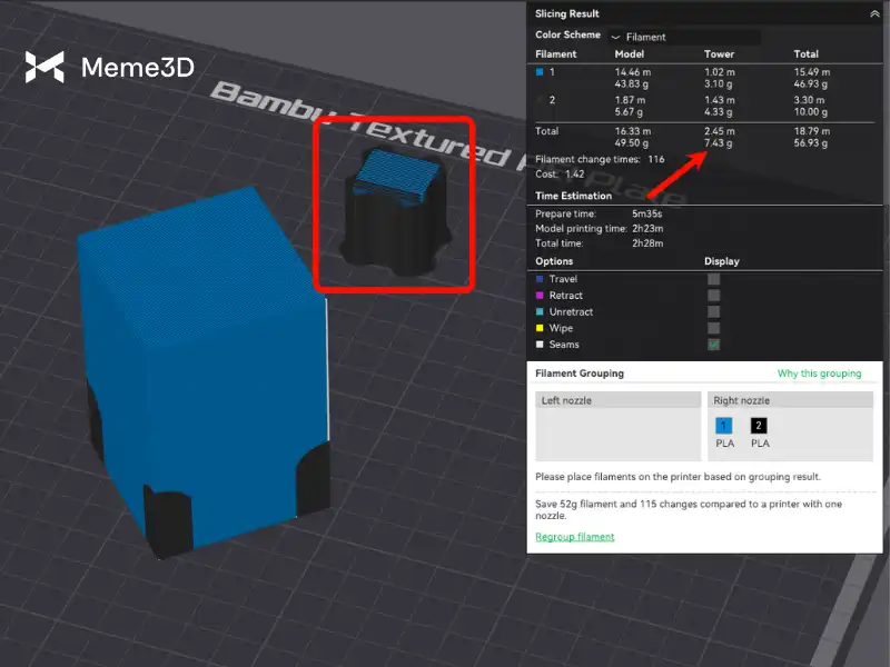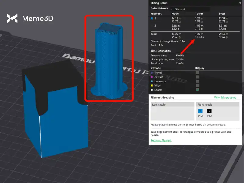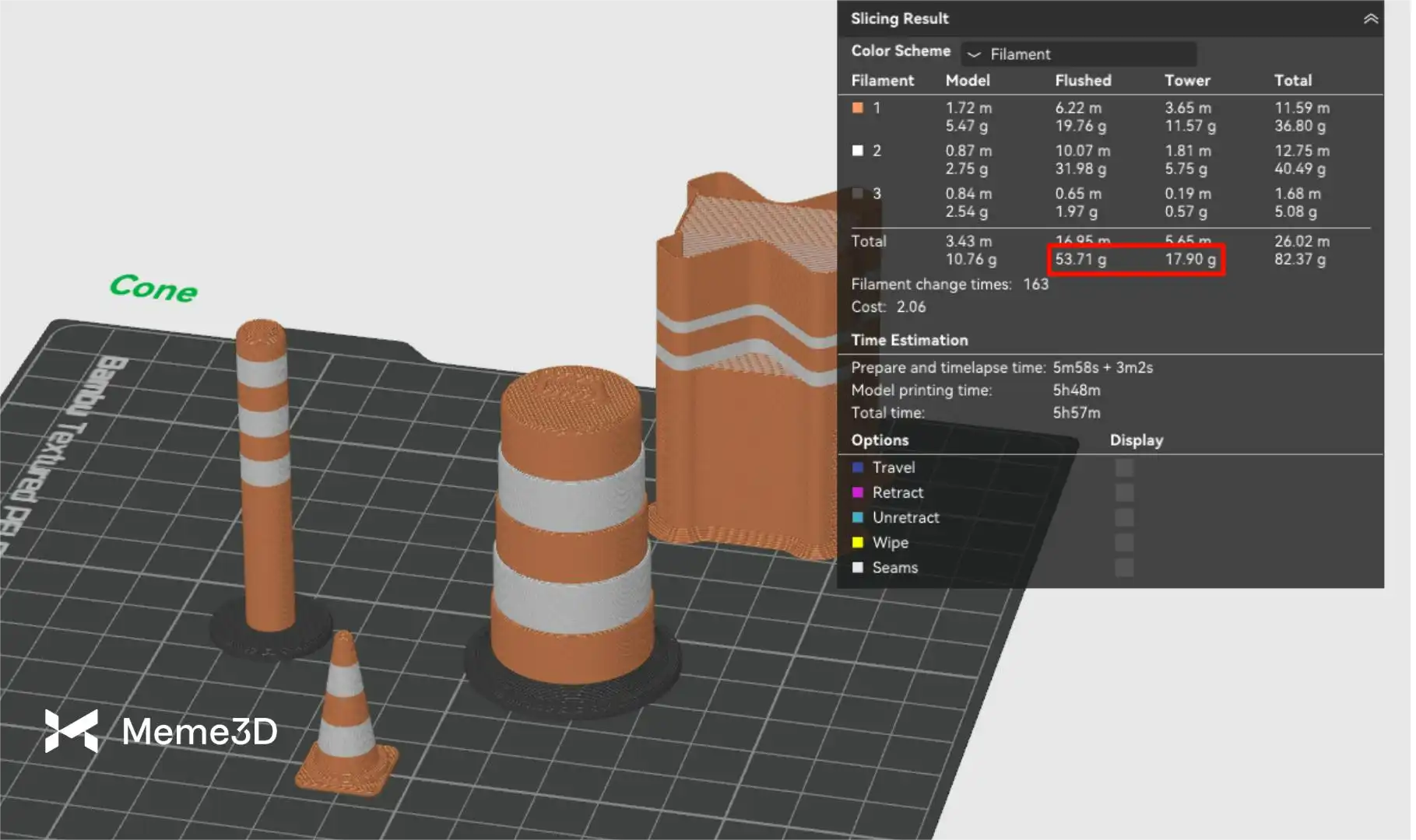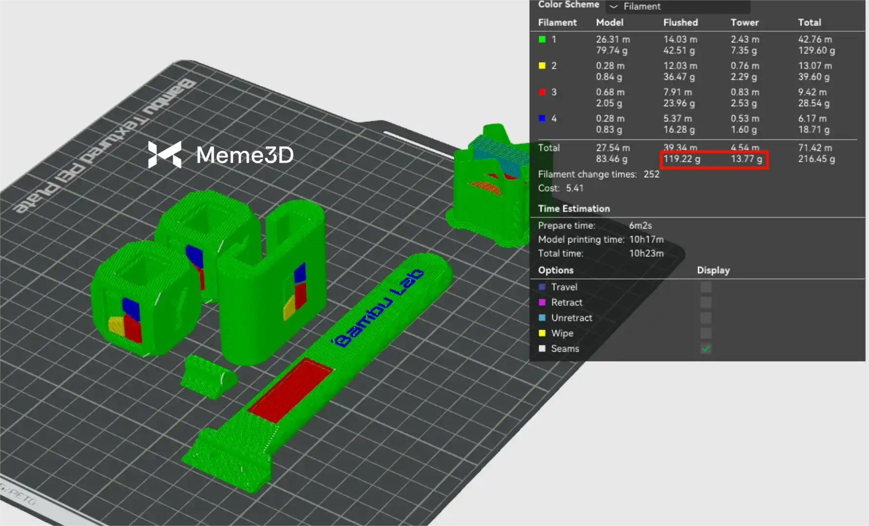 Khi in riêng lẻ, tổng lượng vật liệu thừa là 25 gram chỉ với 16 lần thay sợi. Như hình trên, khi in chúng cùng nhau, lượng vật liệu thừa lên tới 101 gram, gấp khoảng bốn lần! Điều này minh họa rằng số lần thay sợi trên mỗi lớp mới là yếu tố quyết định cuối cùng đến lượng vật liệu thừa, chứ không phải tổng số sợi được dùng chung trên toàn bộ vật thể.