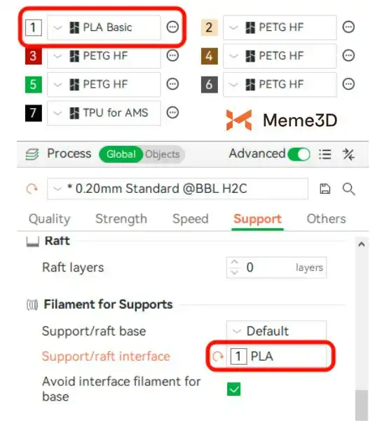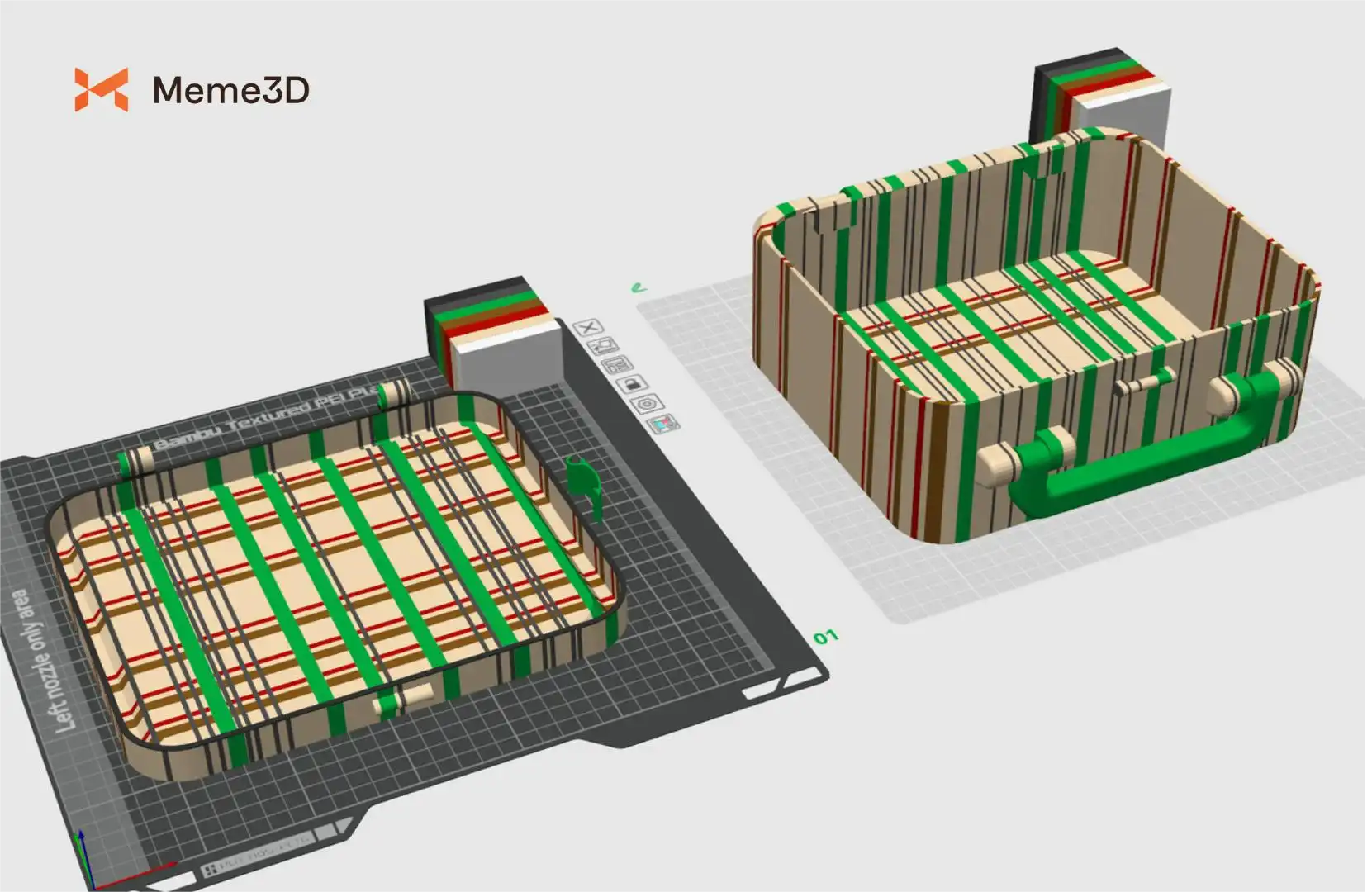 Phần thân hộp có thể được in bằng 5 màu PETG để đảm bảo dễ lau chùi, trong khi PLA được dùng cho lớp interface của support nhằm tối ưu chất lượng các chi tiết overhang và bridge.