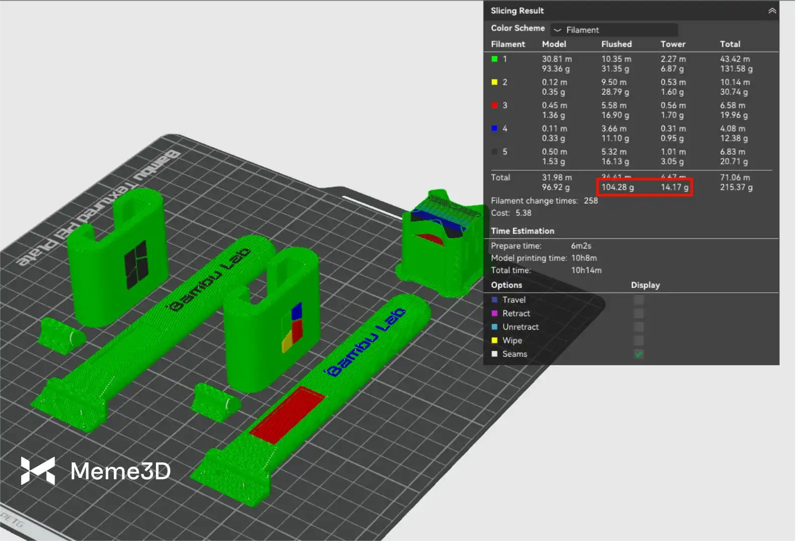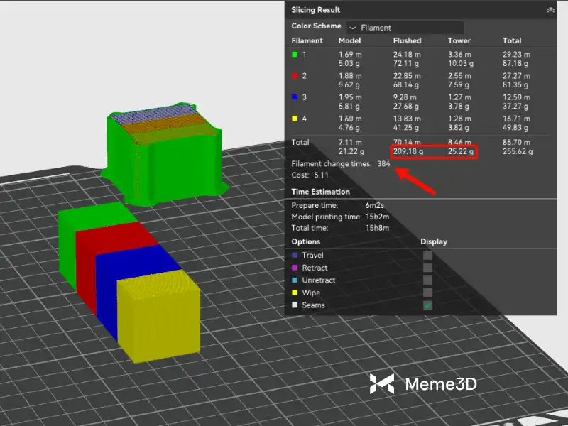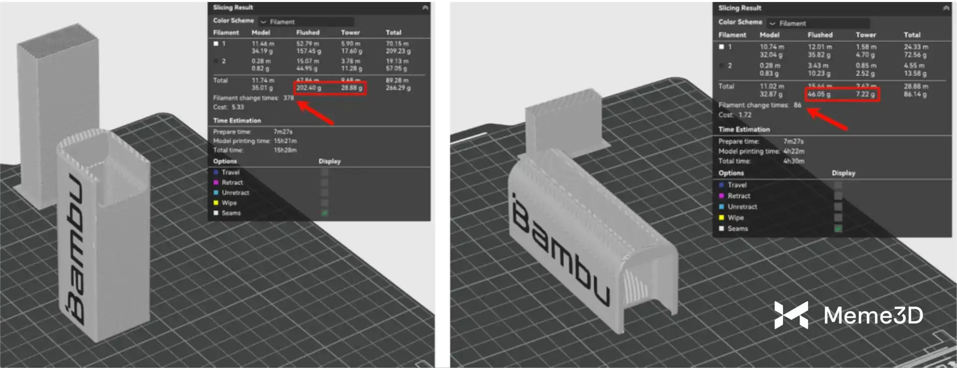 Như đã thảo luận ở trên, lượng sợi nhựa “bị lãng phí” trong một bản in là lượng sợi được đùn ra trong cả hai bước xả và làm sạch trong mỗi quy trình thay sợi nhựa. Do đó, tổng lượng sợi nhựa bị lãng phí có liên quan trực tiếp đến tổng số lần thay sợi nhựa (mỗi lần thực hiện quy trình thay sợi nhựa) cho một bản in nhất định.