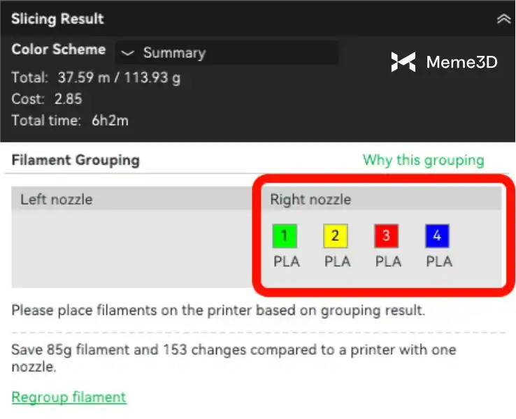 Kết quả của việc phân nhóm nhựa in (filament grouping) sẽ được thông báo tại thời điểm cắt lớp (slicing), bằng cách hiển thị cụ thể loại nhựa nào cần kết nối với vòi phun (nozzle) nào như trong hình dưới đây. Bạn sẽ thấy rằng, vì máy H2C có sẵn 5 cụm đầu phun (hotends) cho bản in sử dụng vòi phun 0.4mm này, nên cả 4 loại nhựa có thể được chỉ định đơn giản cho vòi phun bên phải để phân bổ giữa các Cụm đầu phun cảm ứng Vortek (Vortek Induction Hotends) khác nhau.
